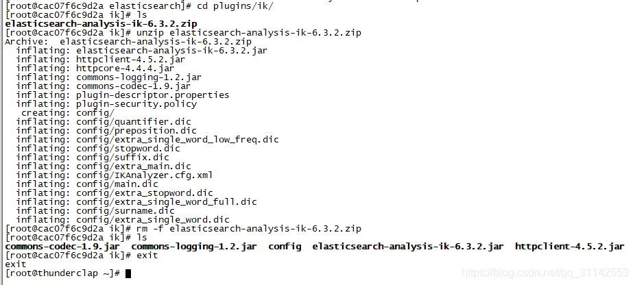 3)再次进入es容器内部,使用unzip命令将压缩包解压。