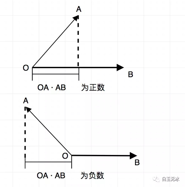 向量的点乘,表示一个向量在另一个向量上的投影,是个标量,有正负之分。向量夹角小于 90度 为正数,等于 90度 为 零,大于 90度 为负数。