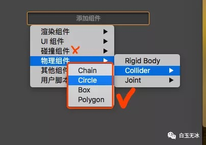 既然是物理系统中的碰撞检测,我们在编辑器里添加的是物理系统中的碰撞器,而不是引擎的碰撞器,不要选错了哦。