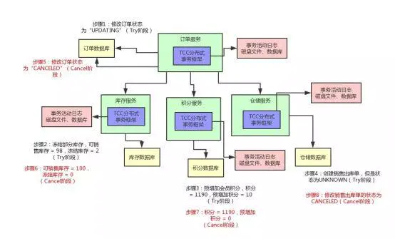 c) Cancel 阶段主要是在业务执行错误,需要回滚的状态下执行的业务取消,预留资源释放。