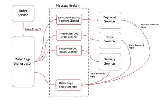 saga协调器orchestrator以命令/回复的方式与每项服务进行通信,告诉他们应该执行哪些操作。