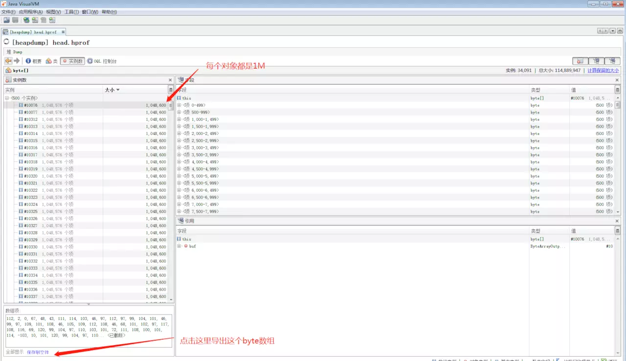 接下来我们双击第一行的"byte[]" 查看这些byte数组的明细. 可以看很多的对象都是1048600byte, 也就是刚好1M, 不过这样还是看不出这个数组的内容, 所以我们导出这个数组到本地, 如下图: