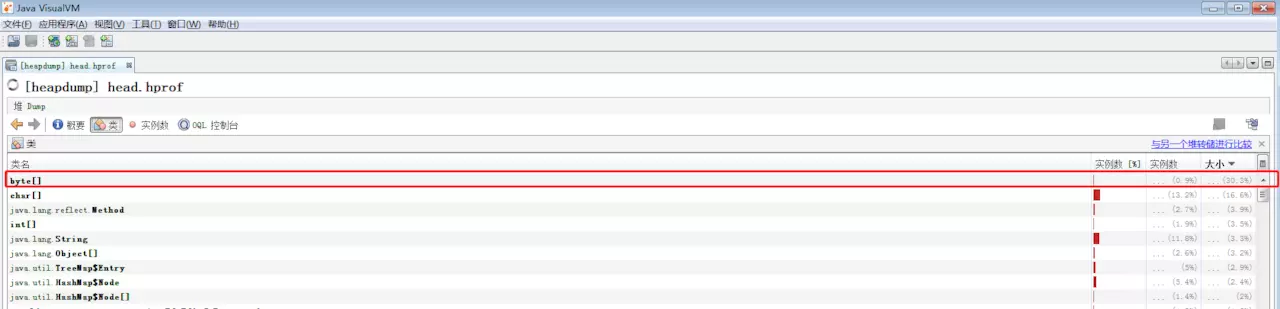 可以看出, 堆里面的byte数组实例数占比只有0.9%, 内存大小占比却高达30%, 说明每一个实例都是大对象.