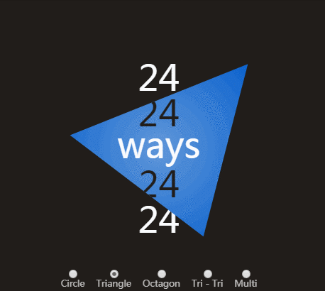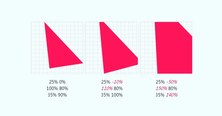 通过定义超过0%-100%范围的点,我们可以把一个有三个点的多边形变成四边形、五边形或六边形。在这个例子中,都是定义clip-path: polygon()函数的三个点,但是由于超出了元素框的边界,我们可以看到一个三角形和两个五边形。