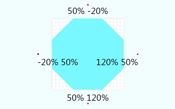 上面实现一个八边形,我们设置了八个点的坐标。但是,我们可以跳出元素框的限制去思考,也就是说要跳出0% - 100%的这个范围。