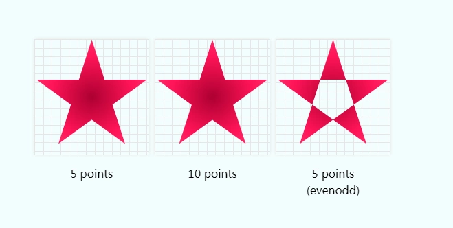 polygon()函数不仅仅是一组坐标点的集合,它还有另外的一个参数 — [填充规则] ,我们一直使用的默认值是nonzero,它还有另外一个值是evenodd,这两个值它们确定形状的内部和外部的规则是不同的。