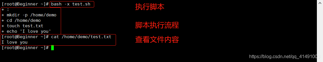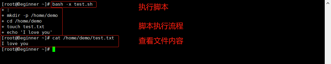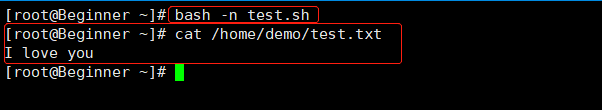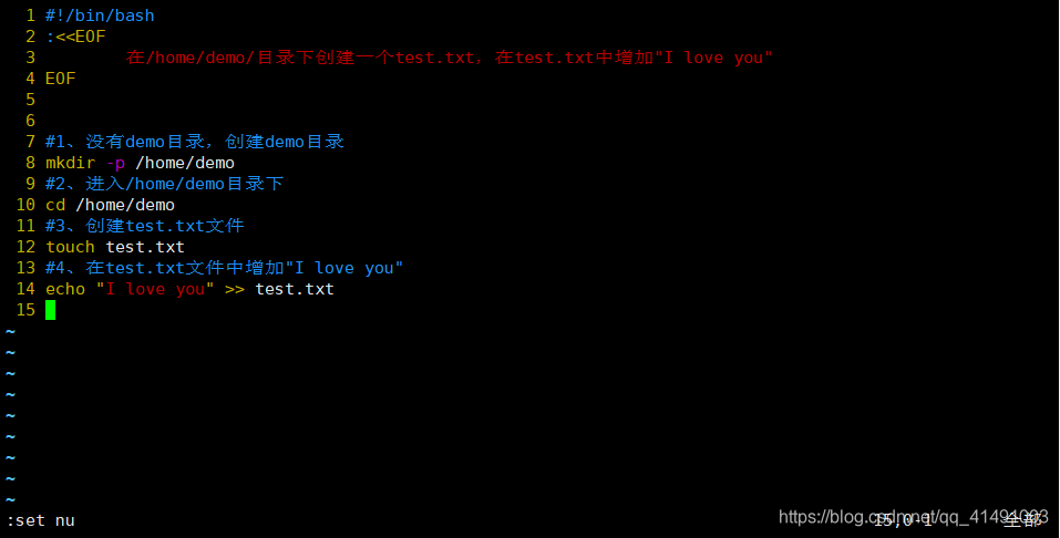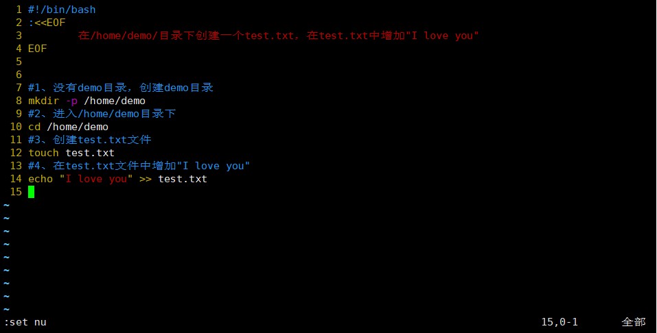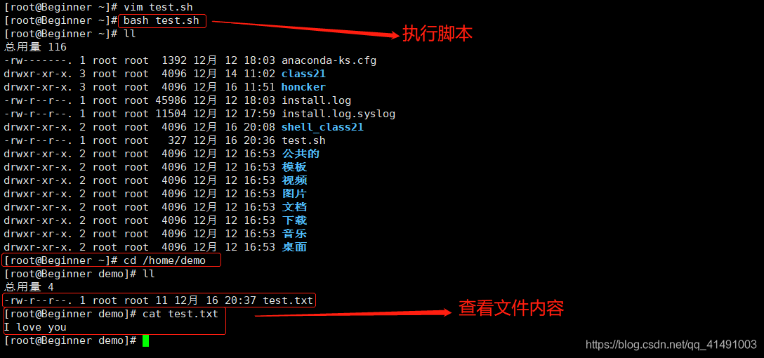 ①需求:在/home/demo/目录下创建一个test.txt,在test.txt文件中添加"I love you"。