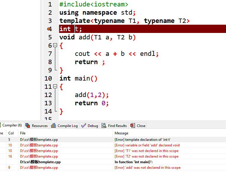 在template语句与函数模板定义语句<返回类型>之间不允许有别的语句,否则会报错。模板函数类似于重载函数,但是两者有很大区别:函数重载时,每个函数体内部可以执行不同的动作,但是同一个模板实例化后的模板函数都必须执行相同的动作。