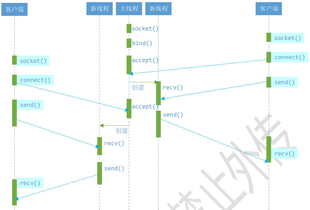上述多线程模型,主线程持续等待客户端的连接请求,如果有连接请求,则创建新线程,并在新线程中提供为第一个例子同样的服务。