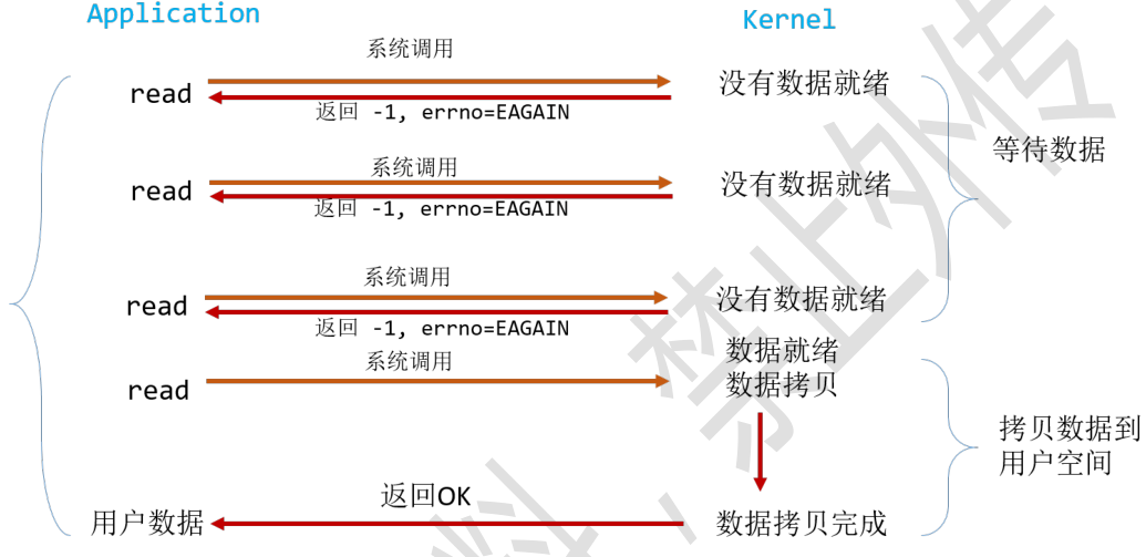 这个系统调用。non-blocking IO 执行过 read 这个系统调用的时候,如果kernel 的数据没有准备好,这时候不会 block进程,但是 当 kernel 中数据准备好的