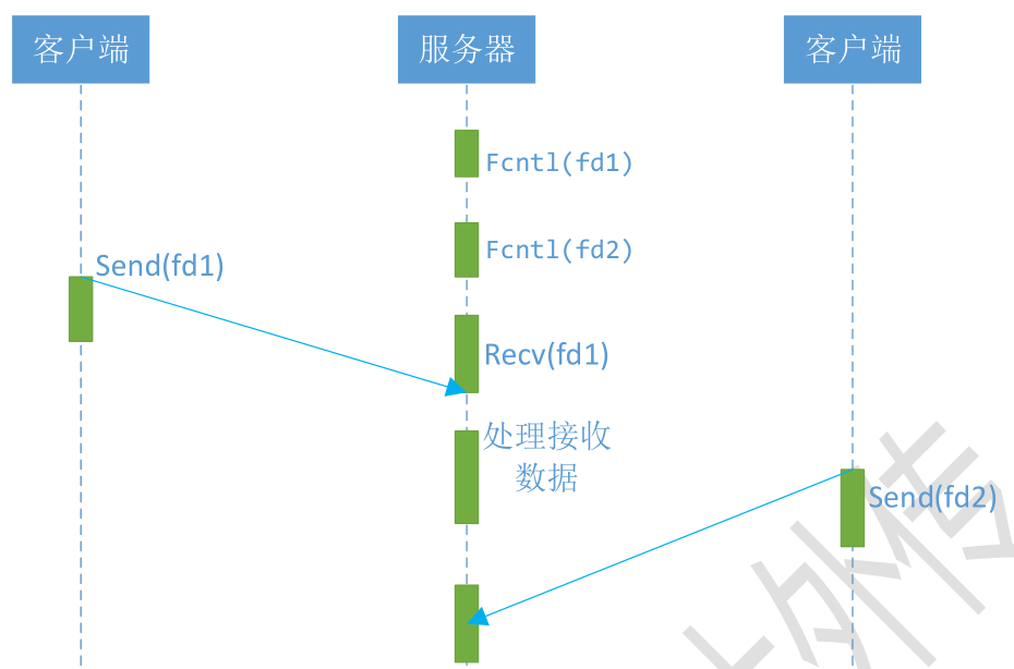 继续改进上述C/S模型,采用单个线程,但是能同时从多个连接中检测数据是否送达,并接受数据的模型: