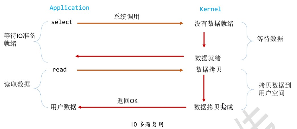 这个图和 blocking IO 的图其实没有太大不同,事实上还更差一点,因为这里需要调用两个系统调用 (select和read),而blocking IO只调用了一个系统调用read,