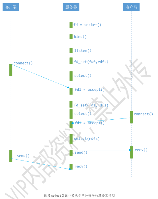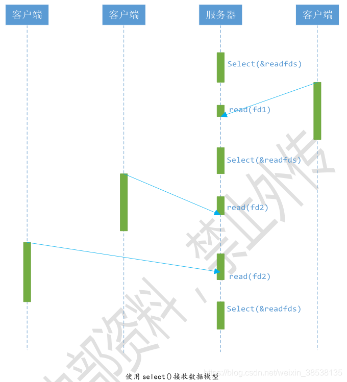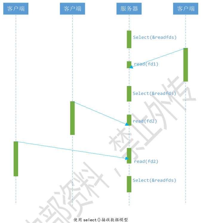 上述模型只是描述了使用select接口同时从多个客户端接收数据的过程,由于select接口可以同时对多个fd进行读状态、写状态和错误状态的检测,