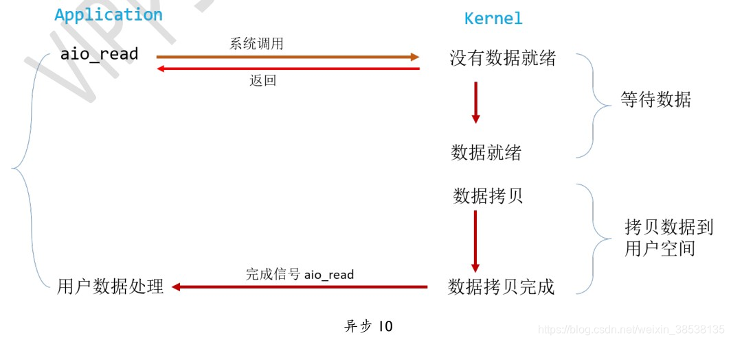 返回再也不理睬了,直到kernel 发送一个信号,告诉进程说 IO 完成。整个过程中,用户进程完全没有被 block。
