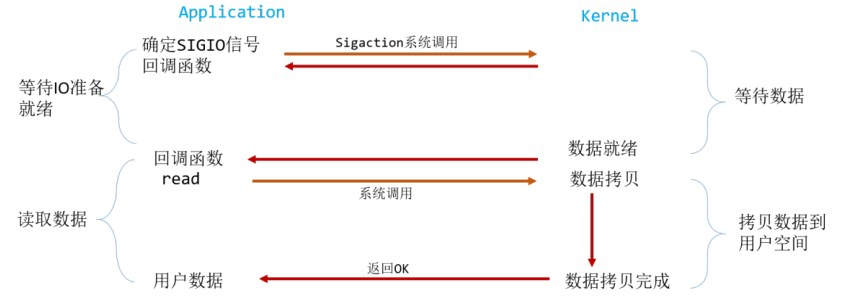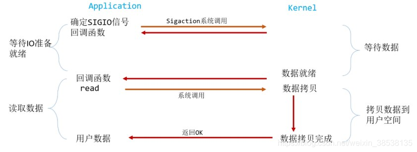 首先允许套接字进行信号驱动IO,并安装一个信号处理函数,进程继续运行并不阻塞。当数据准备好时,进程会收到一个SIGIO 信号,可以在信号处理函数中调用IO