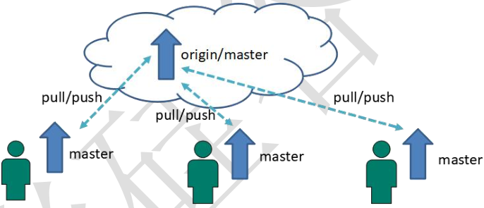 这种方式与 SVN 的主要区别就是开发人员有本地库。Git 很多特性并没有用到。