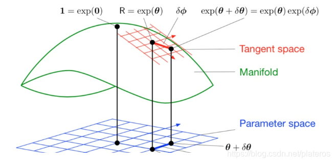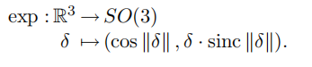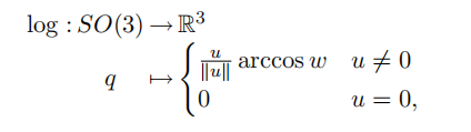 SO(3)由3*3的正交矩阵构成,行列式为1。采用三个参数(欧拉角)表示有奇异性。可以增加一个参数,使用四元组表示。SO(3)又是一个李群,因此,可以定义上文的映射函数