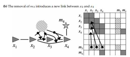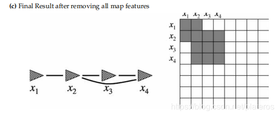 SLAM的图模型通常用信息矩阵表示。[1]第十一章Figure11.2,中给出了图模型与信息矩阵的图示。两种表达方式都包含了地图信息和路径信息。