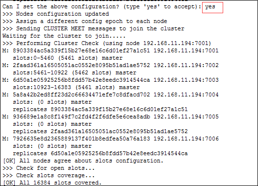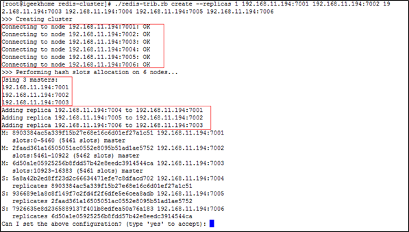 ./redis-trib.rb create --replicas 1 192.168.11.194:7001 192.168.11.194:7002 192.168.11.194:7003 192.168.11.194:7004 192.168.11.194:7005 192.168.11.194:7006 |