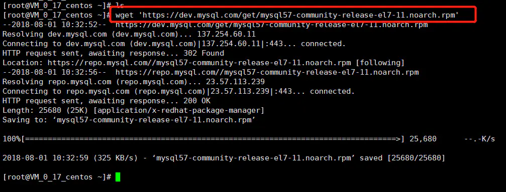 下载yum源:wget 'https://dev.mysql.com/get/mysql57-community-release-el7-11.noarch.rpm'