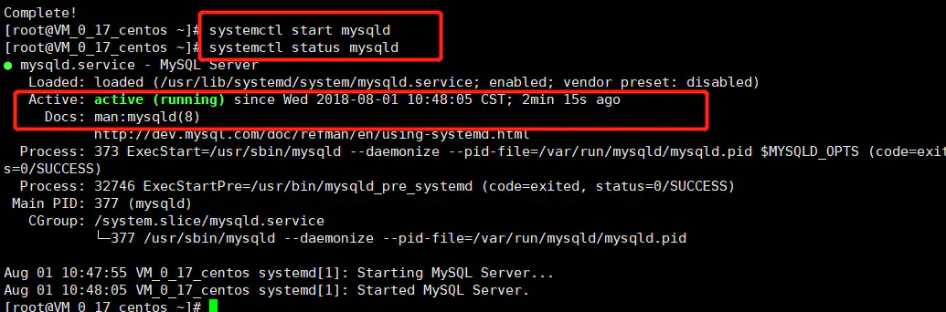 3.启动mysql,要知道在centos7中,没有了service命令,都是使用systemctl命令。注意启动的时候是start mysqld而不是mysql。