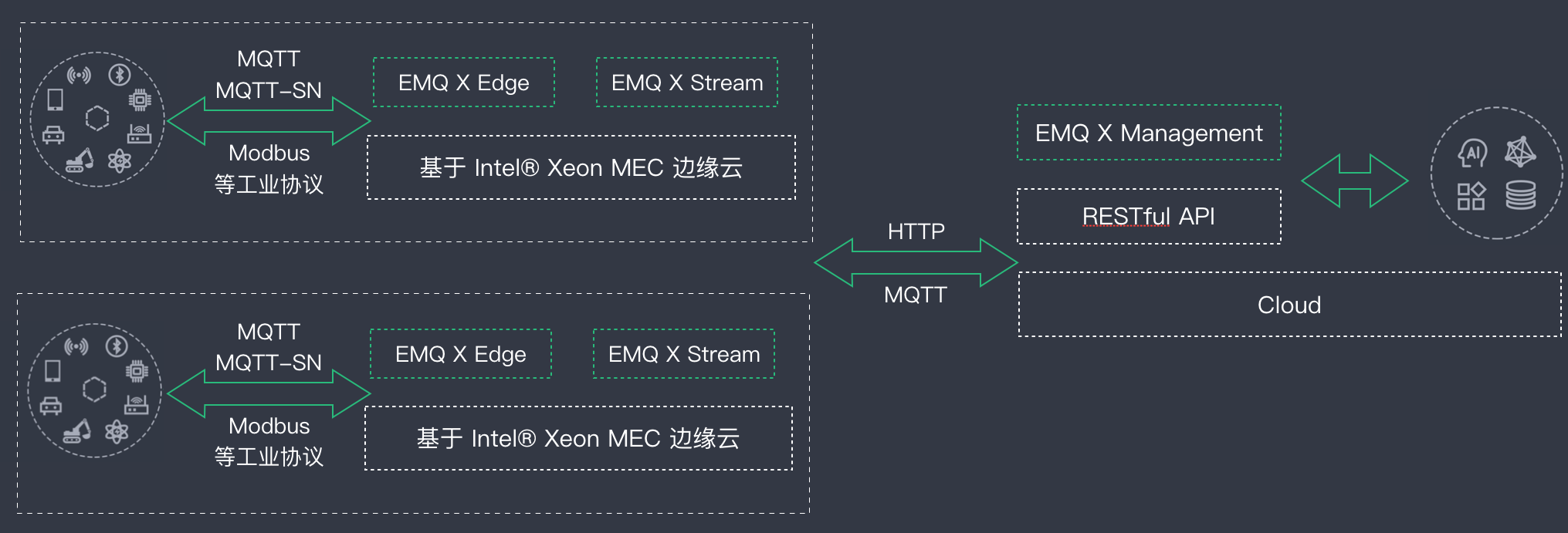 5G 时代的物联网,MEC(多接入边缘计算)技术是主要的业务承载架构。超低时延与海量设备接入业务场景下,靠近用户与数据的位置实现业务的本地处理的需求越来越明显。如何在用户需求动态出现的边缘快速实现业务接入,把业务数据可靠高效的转移到应用模块进行处理,是MEC在架构设计与应用部署上首要解决的问题。 在本届智博会上,EMQ 展示了在 Intel® Xeon 处理器的 MEC 系统提供的边缘云虚拟化环境中实现物联网边缘云设备接入与边缘端流数据能力。EMQ X 基于MQTT 等物联网协议实现的云边一体解决方案可通过云端管理平台对边缘节点实现统一远程管理与调度,为 5G 时代海量物联接入与高可靠低时延连接场景提供接入与数据处理服务能力。