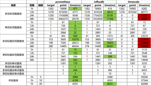 influxdb与prometheus查询效率相当,timescaledb相同场景返回相同数据量差不多消耗至少4倍的时间,其中标红色的是超过1m查询时间的情况。