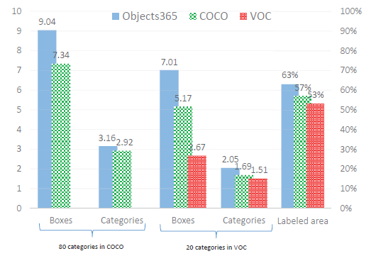 如图2所示,即便只考虑Objects365在COCO和VOC数据集中的80类和20类,在每张图像平均框数和类别数这两项指标上,Objects365依然优于COCO和VOC。标注过程中减少了漏标,平均标注区域占比也超过COCO和VOC。