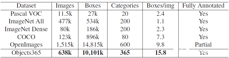 Objects365与其他数据集的比较