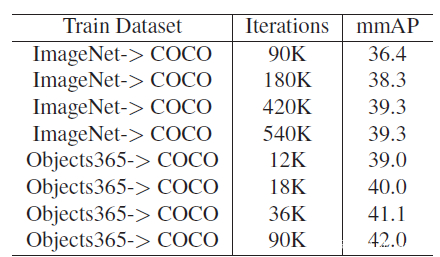 如图3所示,比起传统预训练数据集ImageNet [5],使用Objects365预训练可达到在训练时间缩短至六分之一 (90K次迭代 vs. 540K次迭代) 的情况下mMAP提升2.7个百分点(检测模型使用ResNet50+FPN作为Backbone的Faster RCNN)。