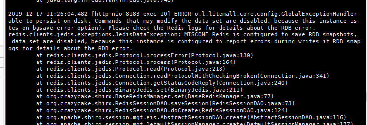 2019-12-17 11:26:04.482 [http-nio-8183-exec-10] ERROR o.l.litemall.core.config.GlobalExceptionHandler -able to persist on disk. Commands that may modify the data set are disabled, because this instance is ctes-on-bgsave-error option). Please check the Redis logs for details about the RDB error.
