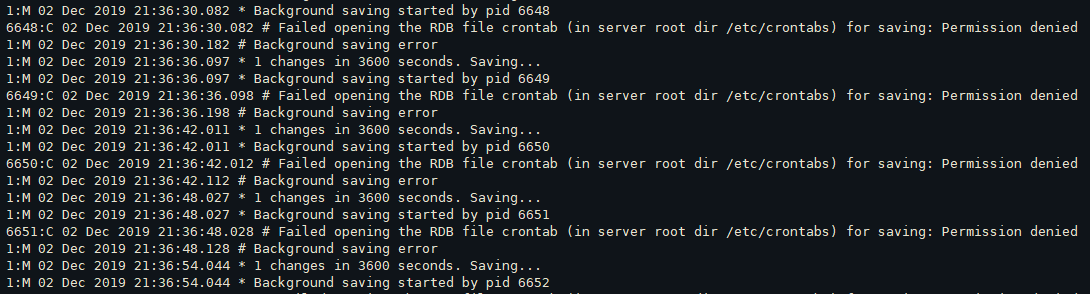 6653:C 02 Dec 2019 21:37:00.061 # Failed opening the RDB file crontab (in server root dir /etc/crontabs) for saving: Permission denied