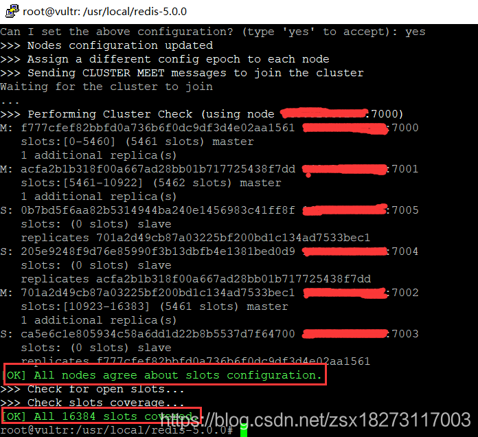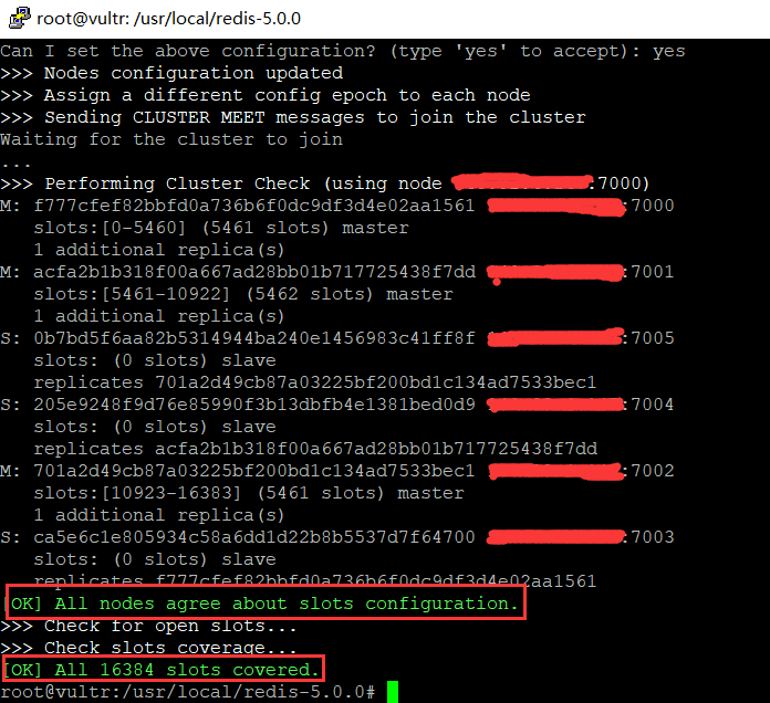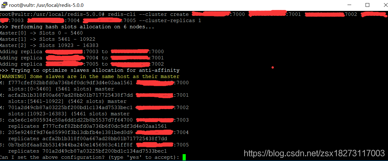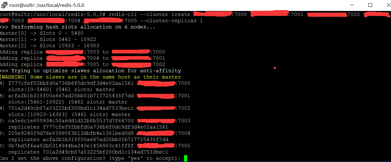 redis-cli --cluster create 192.168.9.206:7000 192.168.9.206:7001 192.168.9.206:7002 192.168.9.206:7003 192.168.9.206:7004 192.168.9.206:7005 --cluster-replicas 1