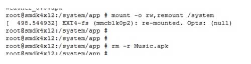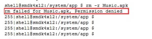 2.在超级终端输入删除命令 rm -r Music.apk,会出现下边错误,原因是 system 文件夹