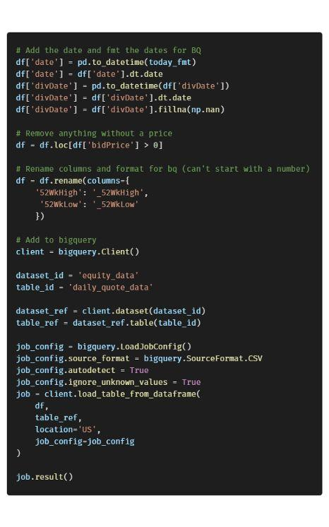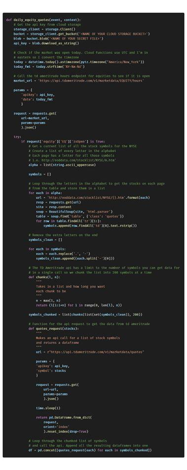 将API凭证存在云存储的文本文件中以防被写死,因为这里只是用API调用来检索凭证。之后检查在当天日期市场是否开放,然后获取NYSE的股票代码,并传给TD Ameritrade API获取当天的数据。