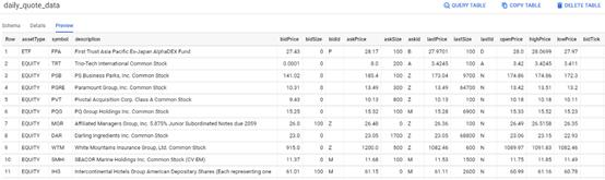 上面只用了收盘价,但是API还返回了许多其他的数据,所以将所有数据存储起来也不错。我创建了一个叫“equity_data”的数据集,表的名字为“daily_quote_data”。如果表先前并不存在,也就是说这是第一次创建,那么今天便会创建新表,之后每天都会有新的数据附加进去。