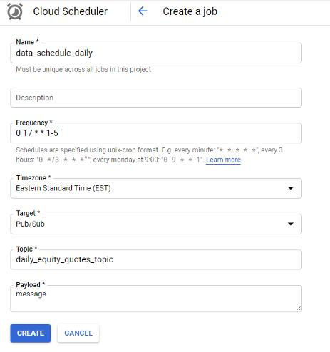 然后转到Cloud Scheduler中设置主题来在需要的时候运行。这里设置为在每个工作日东部时间下午5点运行。频率设置为unix-cron格式。有效载荷就是要发送的信息,写什么都可以,但必须填写。
