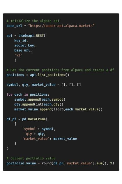 接下来从Alpaca API获得当前头寸和投资组合价值。这里用的是Alpaca的APIWrapper凭证还是存储在云存储的文本文件中。