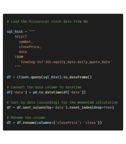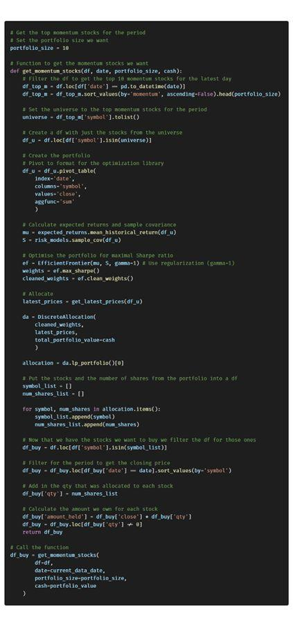 整个云函数比较长,所以这里只是简单总结一下,完整的代码在GitHub上。就像之前所说,策略在这里并不重要。这里使用的是一个简单的动量策略,选择了过去125天里动量最大的10只股票。