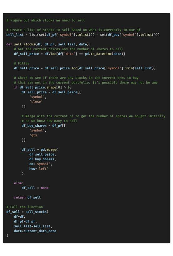 这样就得到了一个数据框,其中包含想要卖掉的股票和数量。接着检查现有的股票数量是否有减少。这里可能没有任何变化,所以必须要进行检查。这样就可以得到需要卖掉的股票的最终数据框。
