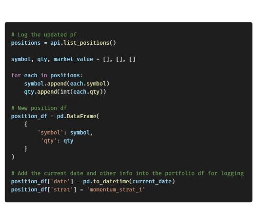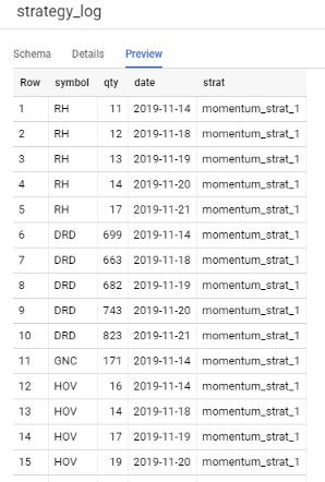 完成之后记录投资组合也是个好做法。Alpaca只允许有一个纸交易账户,所以如果想要(应该要)运行多个算法,就要创建日志自己追踪它们。可以创建策略列来从策略中进行识别。然后可以将它添加到另一个BQ表中。