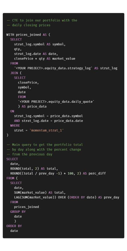 下面的SQL查询可以提供每日总计,还有和前一天的投资组合相比的变化百分比。