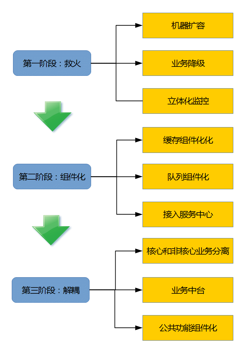 为什么确定这样一个策略呢?主要还是为了集中有限的资源,某个阶段集中解决某一类问题。这样做首先是效率高,因为阶段目标比较明确,做决策和方案的时候无需太多选择;其次是每个阶段都能看到明显的成果,给团队很大的信心。比如说第一阶段的“救火”,做完之后,系统很少因为机器过载、缓存响应慢、虚拟机挂死等问题导致的故障了;完成第二阶段的事项后,因为组件、外部系统故障导致系统故障的问题也很少了。完成前两个阶段后,我们就可以安心的做第三阶段的“服务化”工作了。