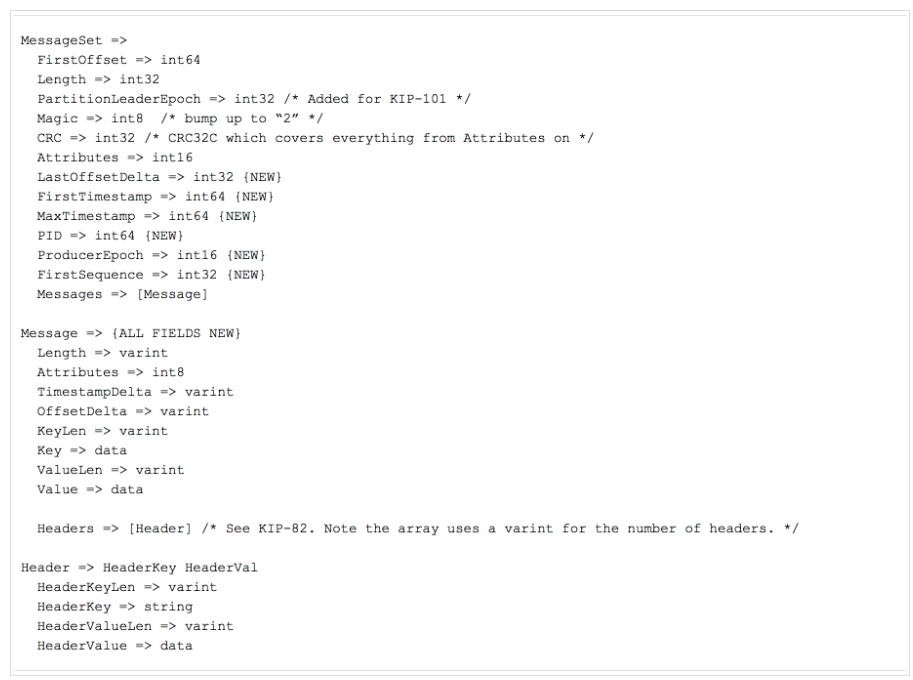 新的数据格式采用了压缩的原理,将公共字段存储到 MessageSet中,将尽量少的字段存储在Message中,做到了数据压缩。随着 Batch的增大,Message 一条数据头部增长 2 bytes(for the message size), 1 byte(for attributes), 2 bytes for(timestamp delta), 1 byte(for offset delta), and 1 byte(for key size)。