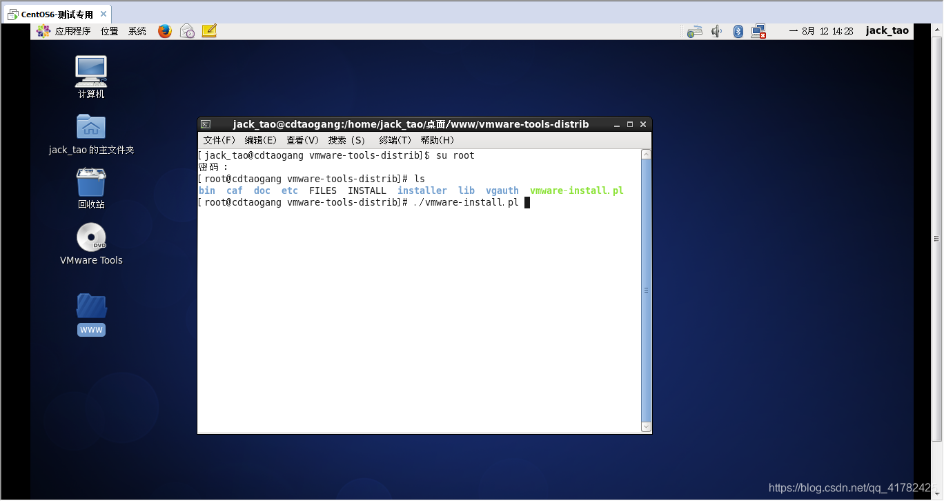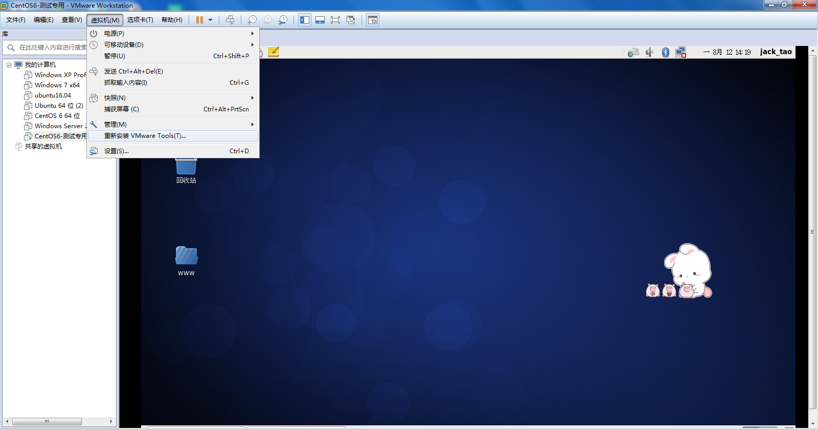 - 在vmware菜单中点击虚拟机中的安装VMware Tools(因为博主已经安装所以显示为重新安装)