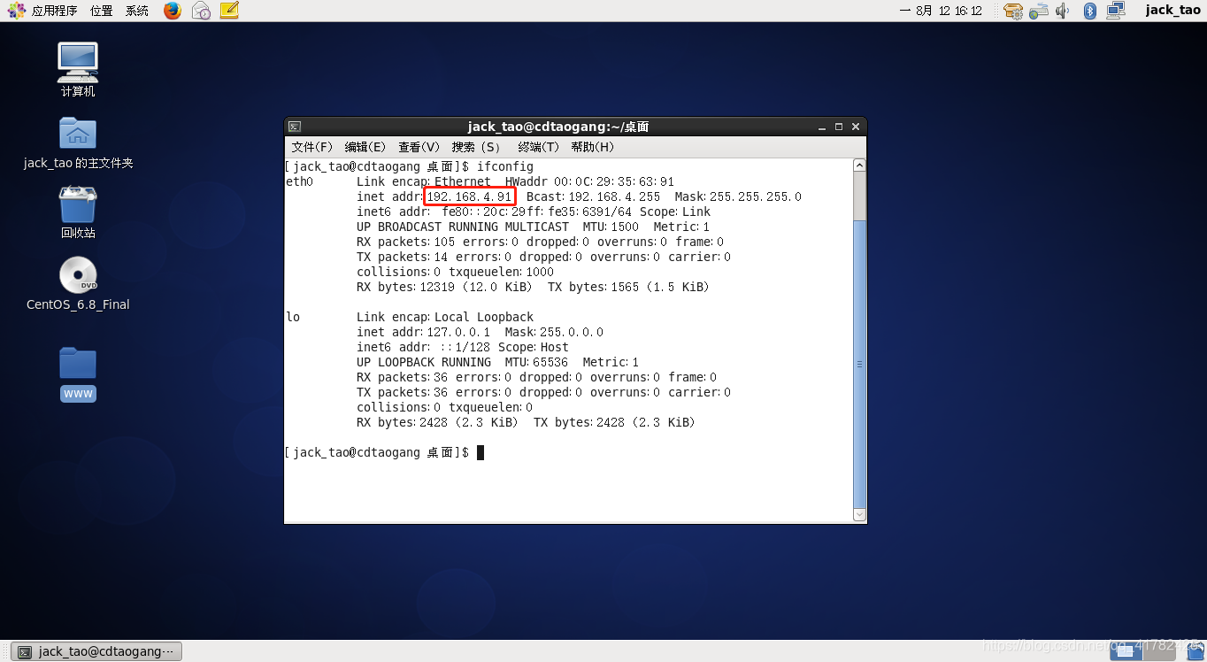- 首先查看centos系统的ip地址(因为毕竟是linux系统,所以在玩这个系统至少需要掌握基本的linux命令)