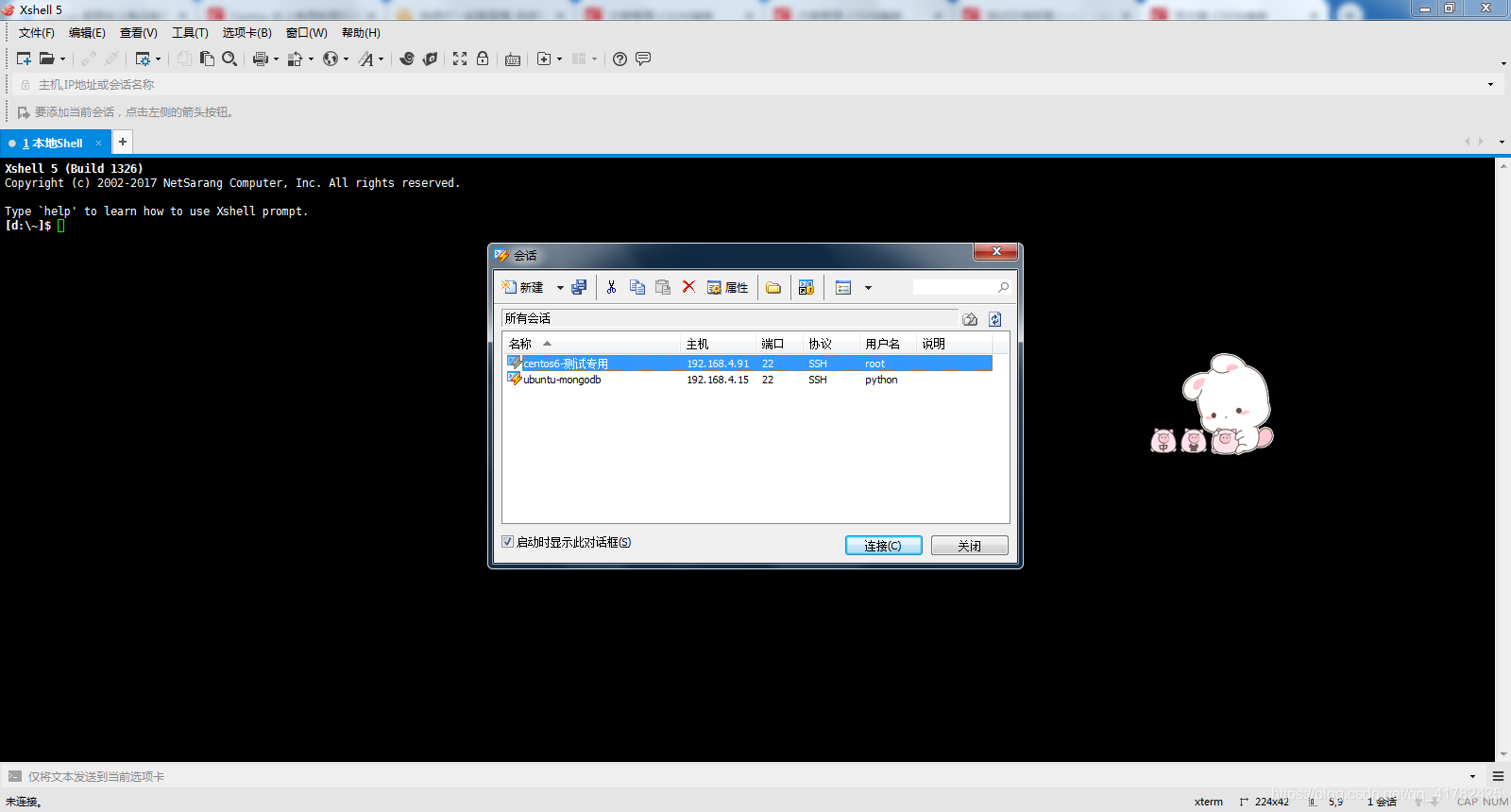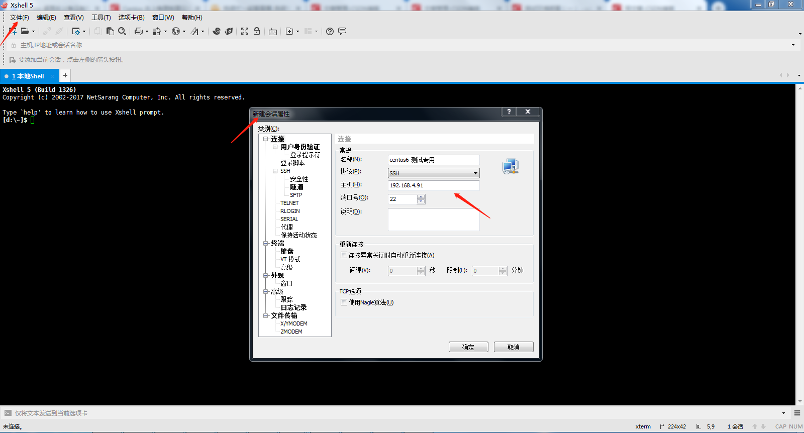 - 打开xshell软件,点击菜单栏中文件——新建,在输入框中输入要连接的目标主机IP地址