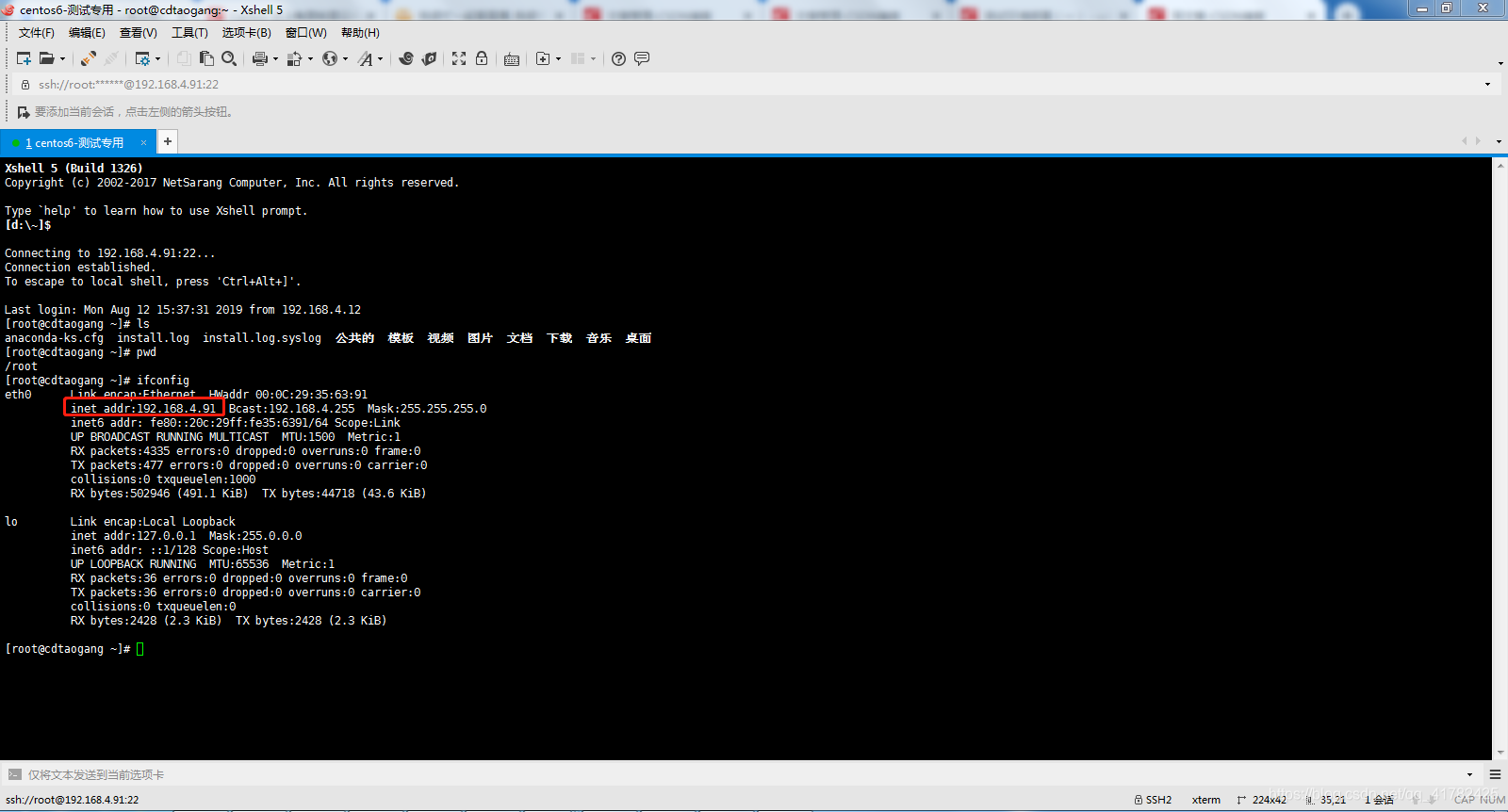 - 连接成功后,显示连接的用户名/主机名,输入ifconfig命令,查看IP地址为连接的主机IP地址,远程连接成功