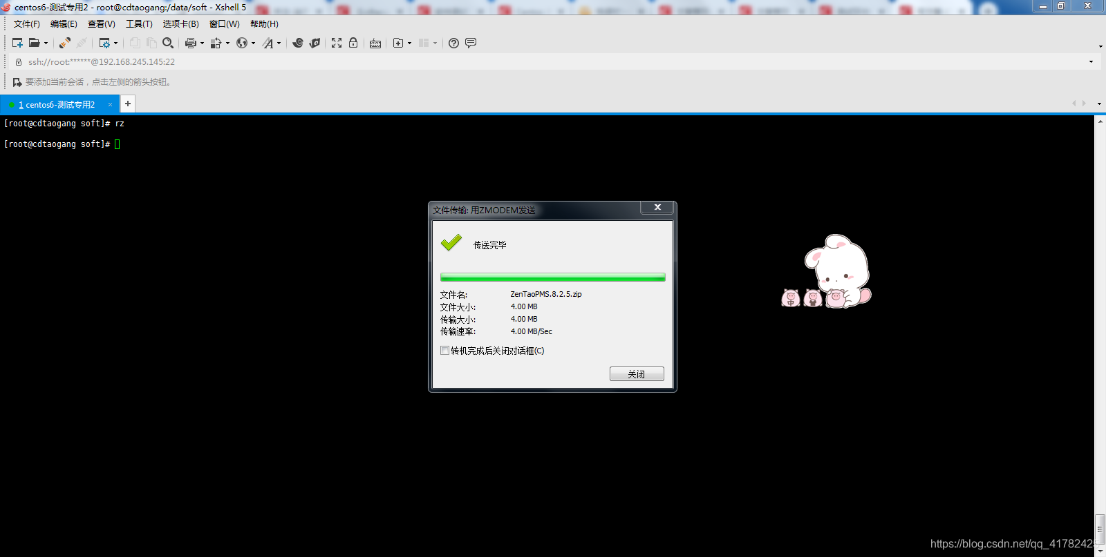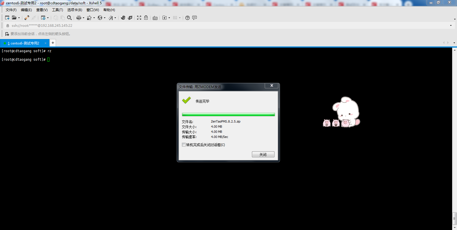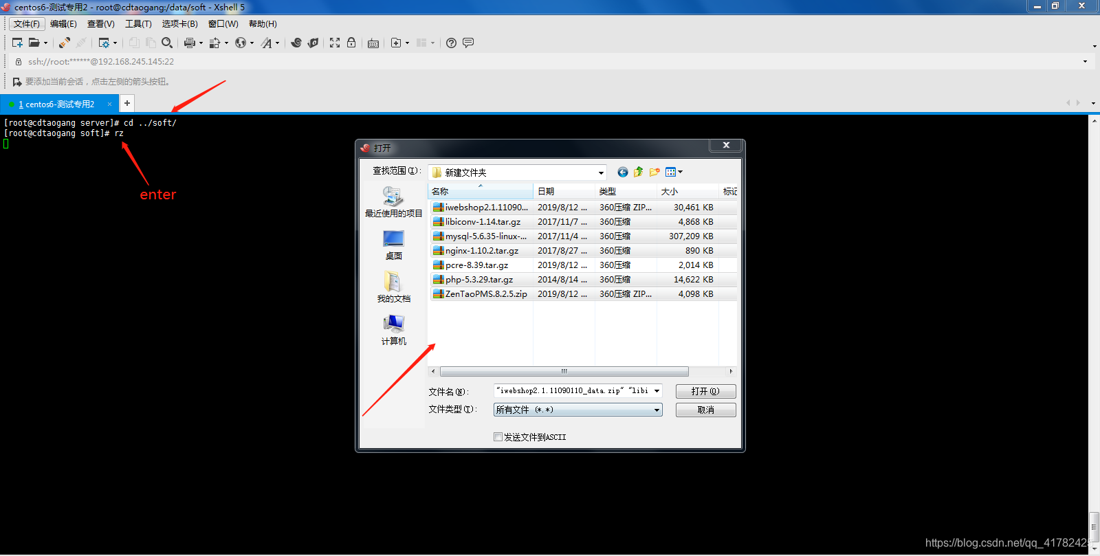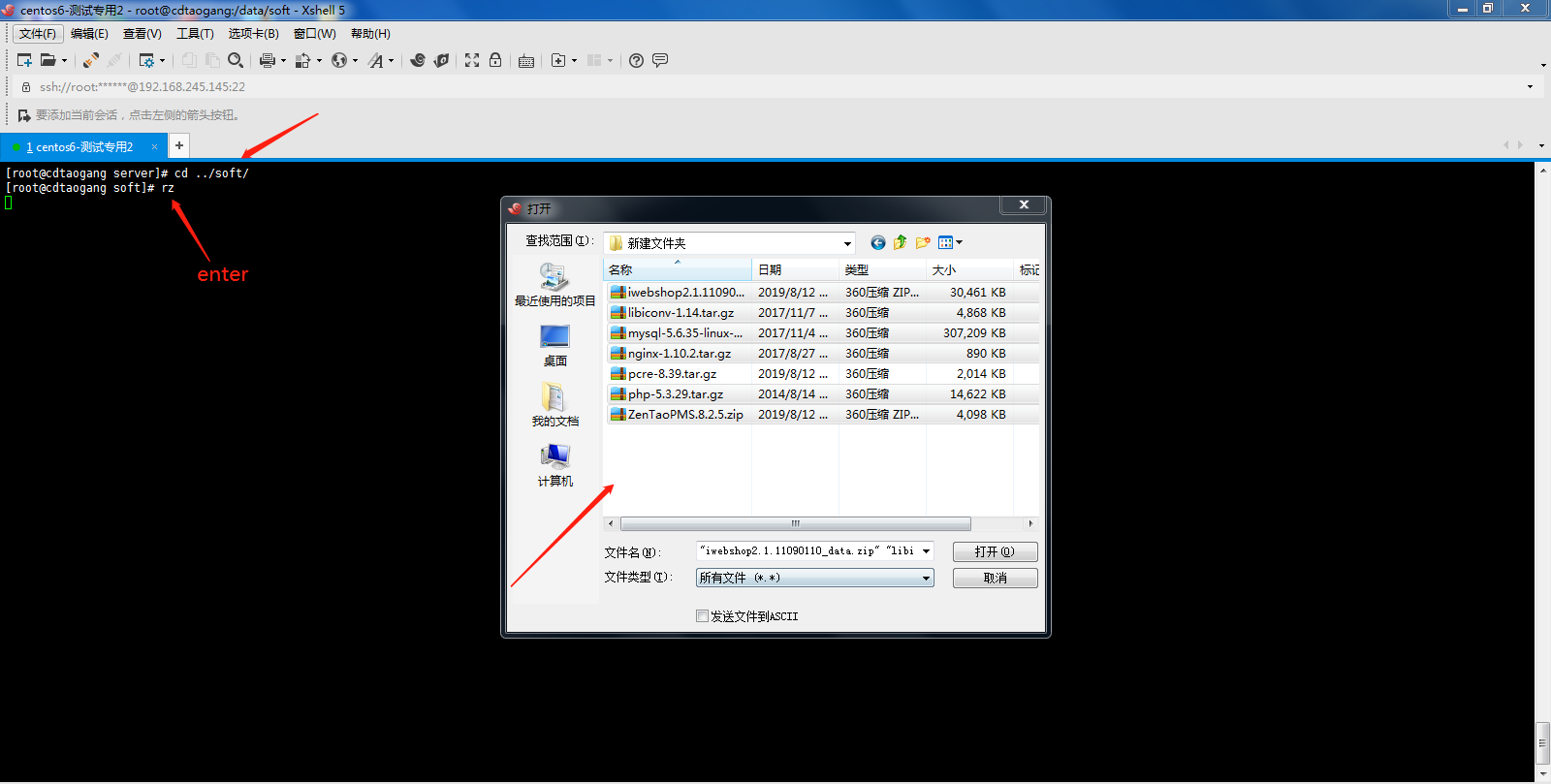 - 然后进入到soft目录,通过rz命令选择要传输的软件,点击打开传输即可