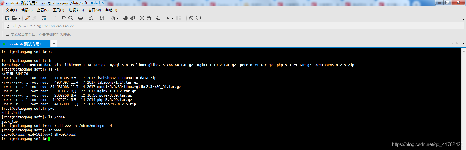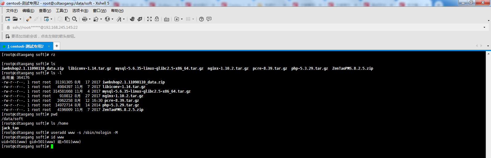 - 当前会话的用户为root为超级管理员用户,那么使用该用户进行nginx的启动用户肯定是不行的因为权限太大,所以需要创建一个没有登录权限的用户来作为nginx的启动用户